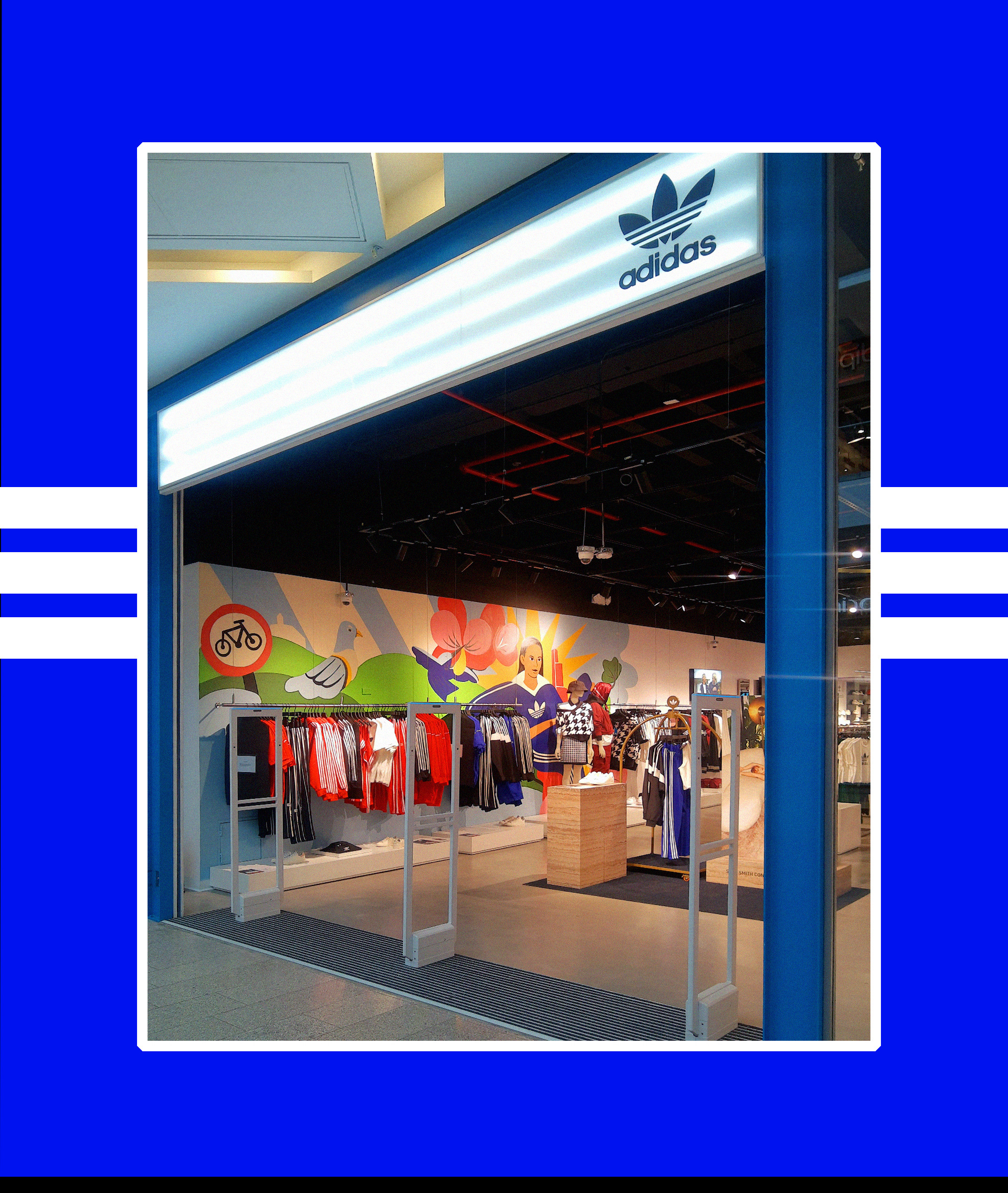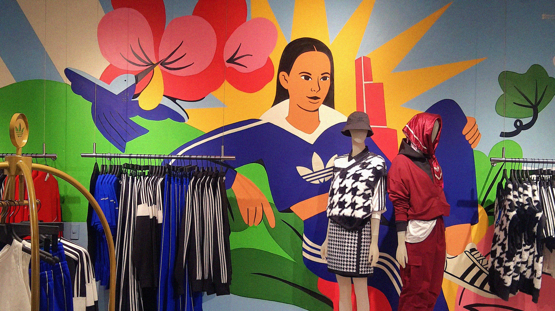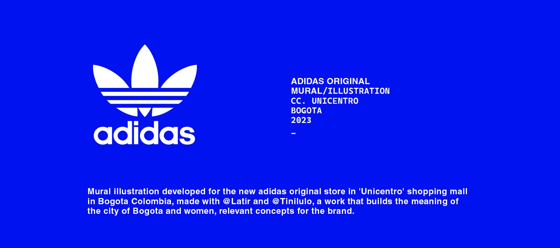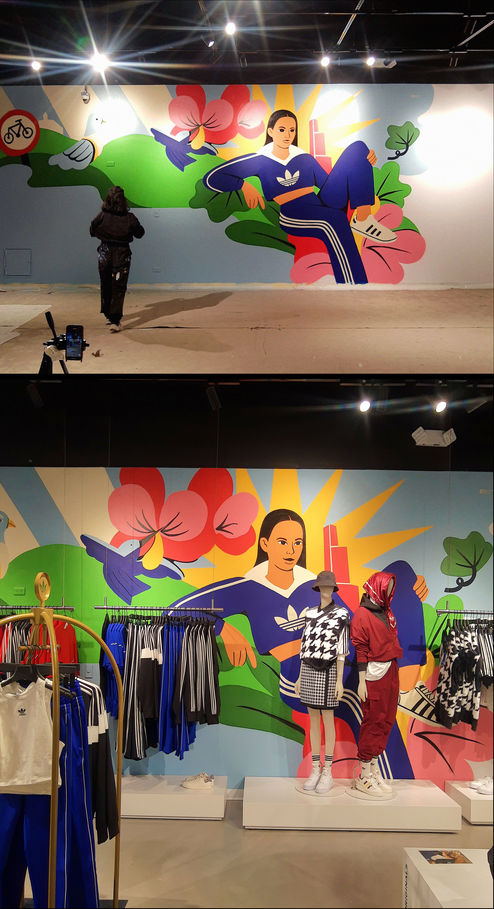 Mural illustration developed for the new adidas original store in the 'Unicentro' shopping mall in Bogota, made with @Latir and @Tinylulo, a work that builds the meaning of the city of Bogota and women, relevant concepts for the brand.